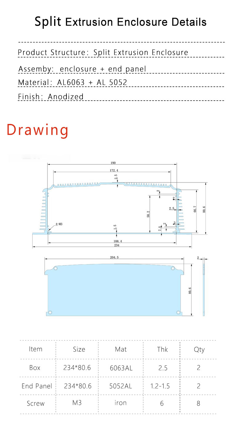 Brand : Pumay External dimensions: 234 x 80.5-L mm / 9.21'' x 3.17''x L '' ( W x H x L ) Internal dimensions: as drawing Stock Length : 250 mm Stock Color :Silver / Black / gray Structure : Split Package weight: near 0.5-0.8 KG Unit Pric
