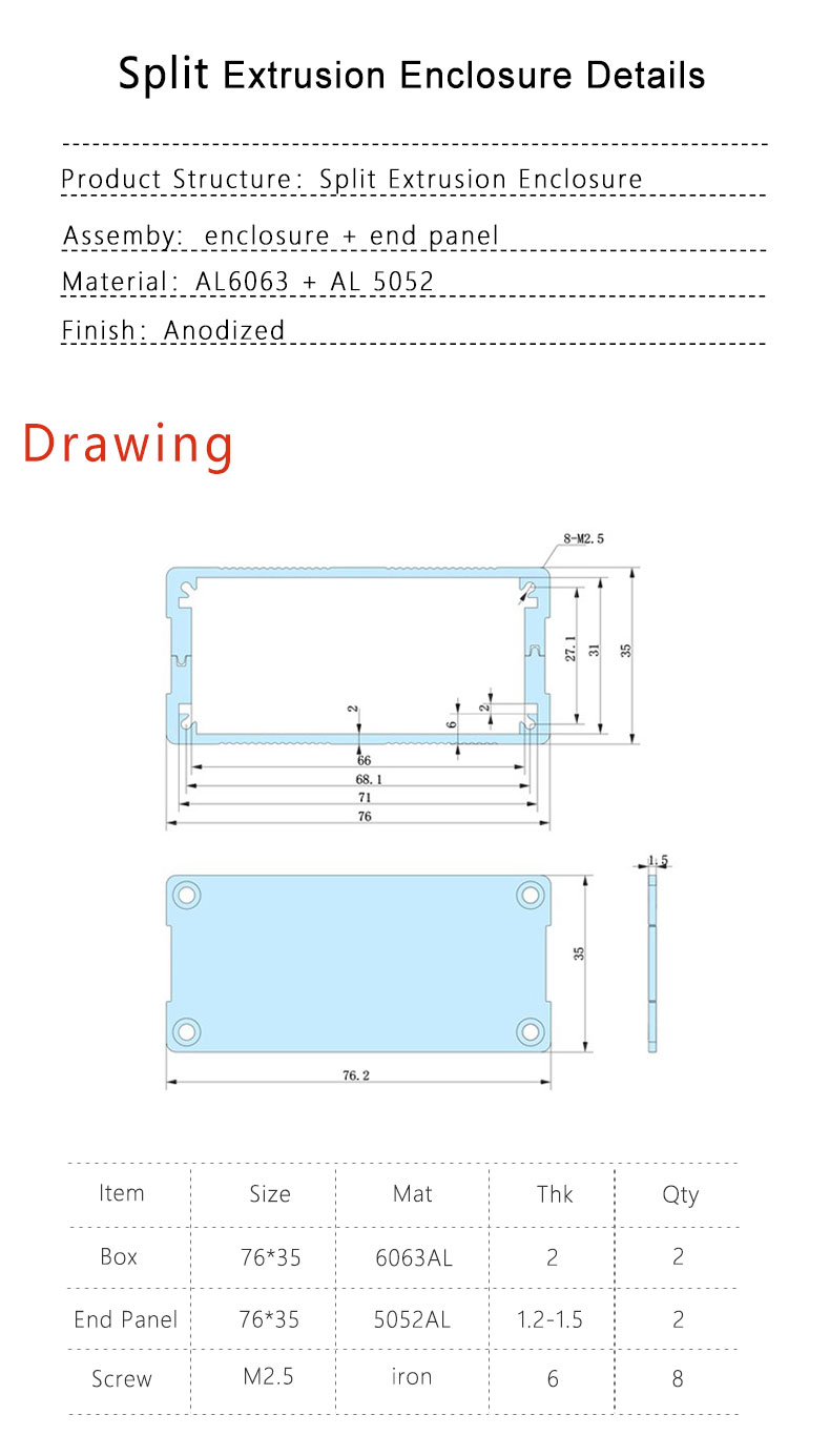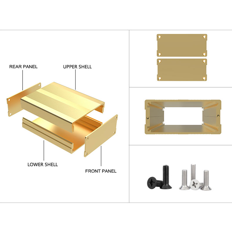 Brand : Pumay External dimensions: 76x35-L mm / 2.99''x 1.38''x L '' ( W x H x L ) Internal dimensions: as drawing Stock Length :100 mm Stock Color :Gold , Black Structure : Split Package weight: near 0.15 KG Unit Price : 1-5USD